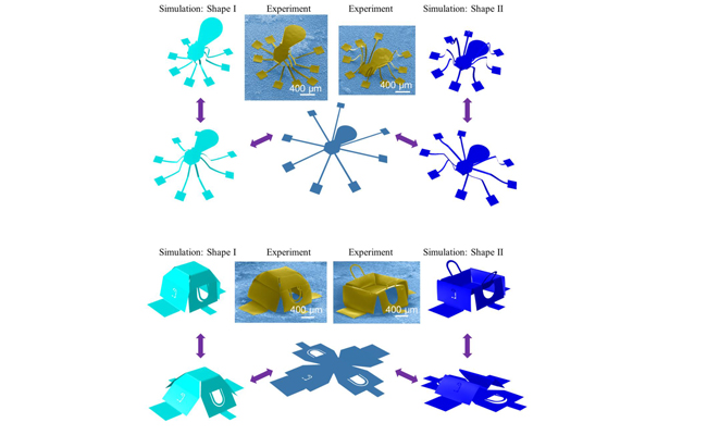 Figure 1. Process of the 3D reconfiguration for two representative morphable mesostructures. The top frame shows the reversible switch between a ‘micro-octopus’ and a ‘micro-spider’, and the bottom frame shows the reversible switch between a ‘micro-house’ and a ‘micro-basket’. The patterned 2D films are assembled into Shape I after simultaneous biaxial compression and Shape II after sequential compression along two perpendicular directions.
