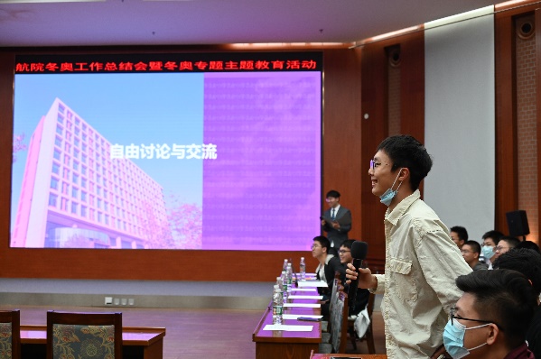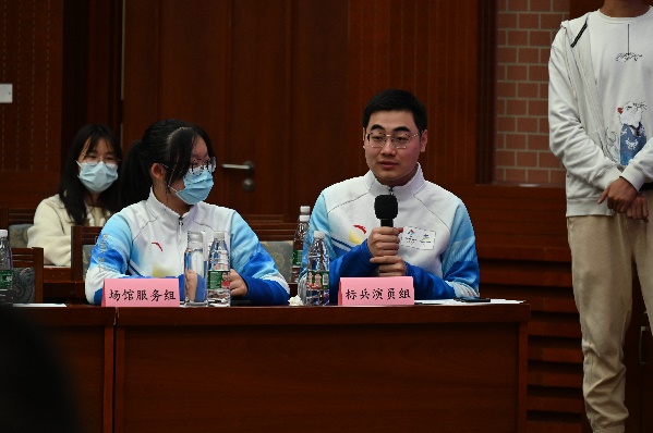 冬奥工作总体情况及冬奥志愿者的发展历程,向大家阐释个人对于志愿者精神和内涵的理解。随后,各项目志愿者代表介绍了自己志愿工作:王秋钧介绍标兵演员志愿者是场馆中的“气氛组”,负责开闭幕式的演练等工作,并分享了开幕式现场镜头之外的有趣故事;王悦迪介绍场馆服务志愿者是离观众最近的志愿者,负责人流控制,看台引导等工作;刘炫介绍反兴奋剂志愿者的工作是“守护纯洁的冰雪”,是兴奋剂检查的第一环,以实际行动弘扬奥运精神,以青年之力书写时代华章;包晗介绍对外联络志愿者作为礼宾助理、翻译等多种角色,承担多项任务,在和外宾交流中充分展现大国志愿者的风采,在闭环内的生活是一次全新的体验。