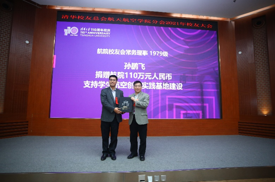 支持学生航空创新实践基地建设。曹炳阳书记为孙鹏飞颁发了捐赠证书。