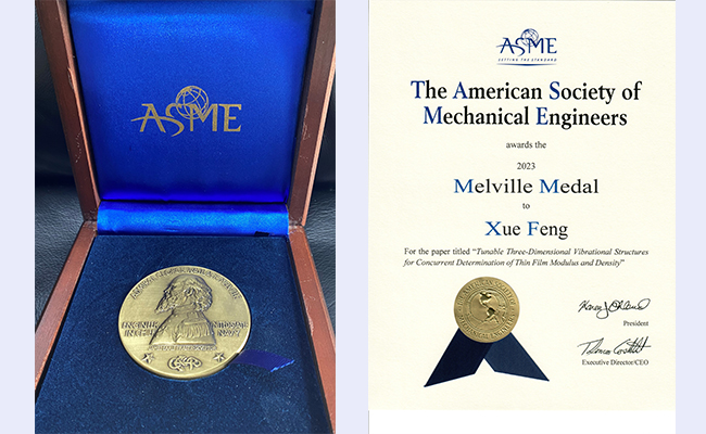 冯雪教授及其团队的研究成果荣获2023年美国机械工程师协会(The American Society of Mechanical Engineers,ASME)梅尔维尔奖(Melville Medal),芮筱亭院士受ASME委托,在机械系统动力学国际会议(International Conference on Mechanical System Dynamics,ICMSD)上向冯雪颁发了证书和奖章。
