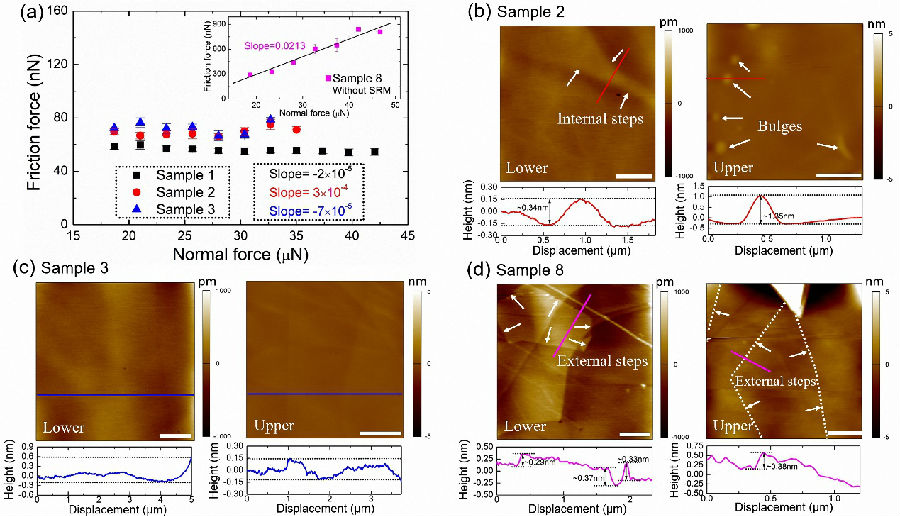图为 微米尺度石墨界面结构与摩擦力的对应关系。(a)对于具有自回复特性的样品1-3,摩擦力几乎与正压力无关,插图为不具有自回复特性样品8,其摩擦力与正压力几乎成正比。(b)样品2的界面形貌:下表面含有内台阶,上表面含有凸起。(c)样品3的界面形貌:上下表面无任何缺陷结构。(d)样品8的界面形貌:上下表面均存在外台阶。图中的尺度棒均为1μm。