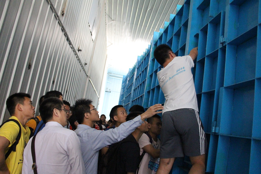 目前最大的风洞实验室,徐老师现场为大家解释了风洞的工作原理、结构布局以及风洞在飞行器研制中的关键作用。同学们亲身感受了风洞中的高速气流,并走进风洞内部,对其内部结构进行探索学习。来自航25班的李北京同学参观后说道:“感觉风洞真是一个神奇的实验设备,在这里我们可以进行很多和飞行器设计有关的实验,它是一个能带给我们很多创新想法的实验平台。”