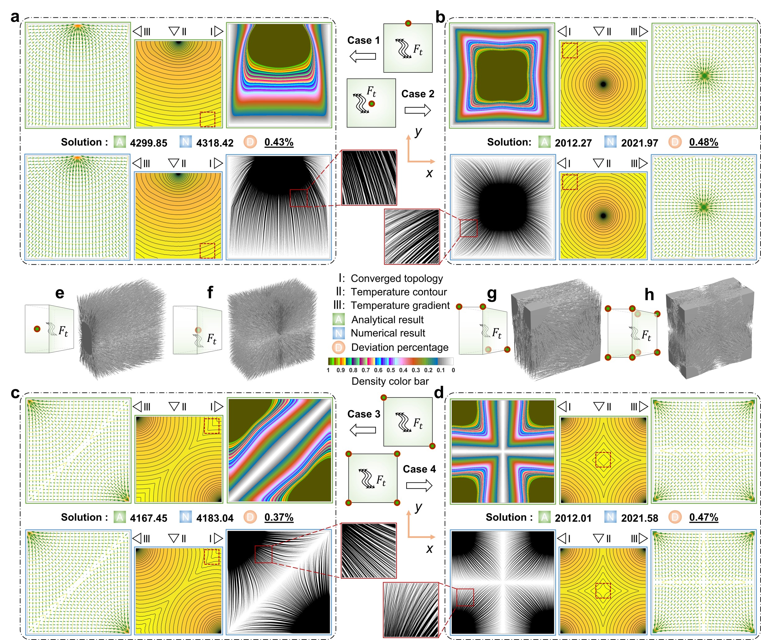 杜建镔课题组在《传热传质国际期刊》(International Journal of Heat and Mass Transfer)发表了题为《传热结构的全局最优解》(On the global optimum for heat conduction)的研究论文,取得了传热结构最优化设计基础理论和方法的重要进展。研究团队在解析上严格证明了稳态传热结构优化问题的梯度优化解具有全局最优性,并给出了收敛到全局最优解的充分必要条件。在数值上验证了该全局最优解的唯一性,证实了其与初始结构设计构型选择无关,与可优化域边界形状无关。识别了该全局最优解的物理特征:在可优化域内,温度等高线线性变化,温度梯度大小处处相等,方向指向冷却槽。从能量角度来看,这种形式最稳定,热传导呈现出与路径无关的特征,为传热结构设计性能评估提供了有力参考。