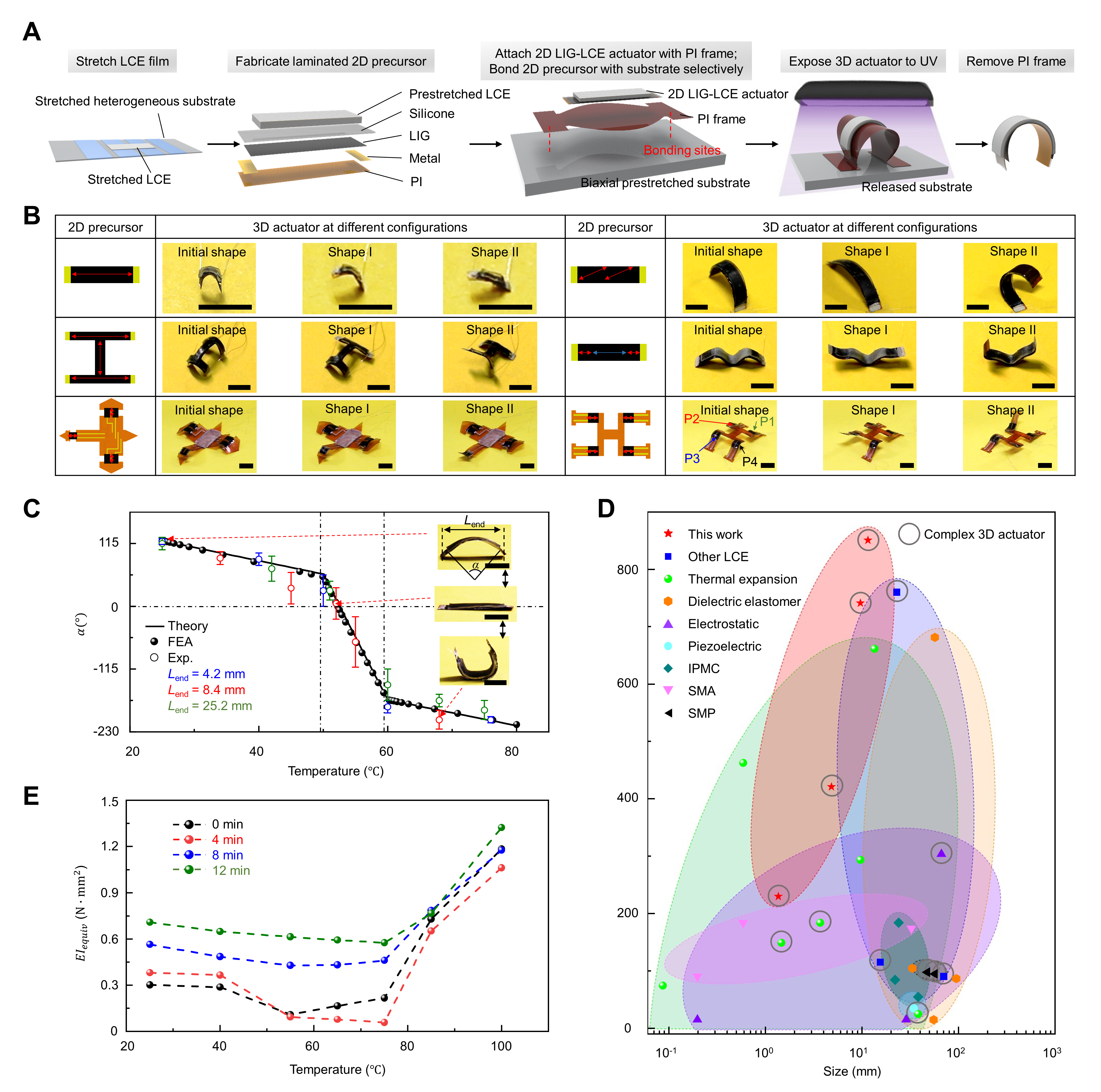 图1.微型软体驱动器的制备方法与性能表征。A图为驱动器制备流程示意图;B图为具备复杂变形效果的三维驱动器;C图为圆弧形驱动器的变形效果表征;D图为现有电响应驱动器的变形能力对比图;E图为驱动器的刚度变化表征