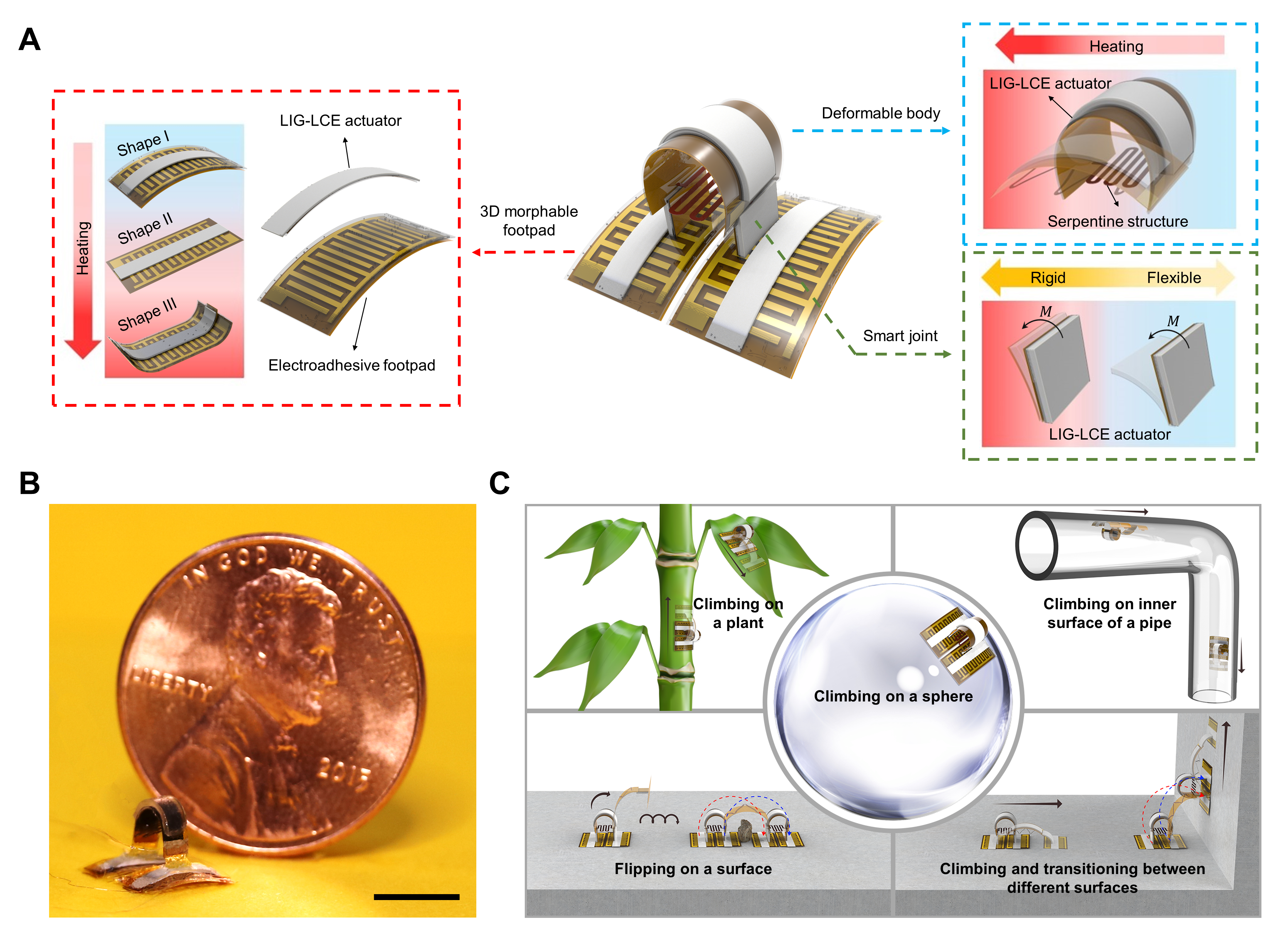 图2. 微型软体攀爬机器人的设计和运动能力展示。A图为机器人各组成部分的分离视图;B图为体长6毫米机器人的光学图像;C图为机器人在不同材质、不同形貌墙面攀爬以及墙面之间过渡的能力展示