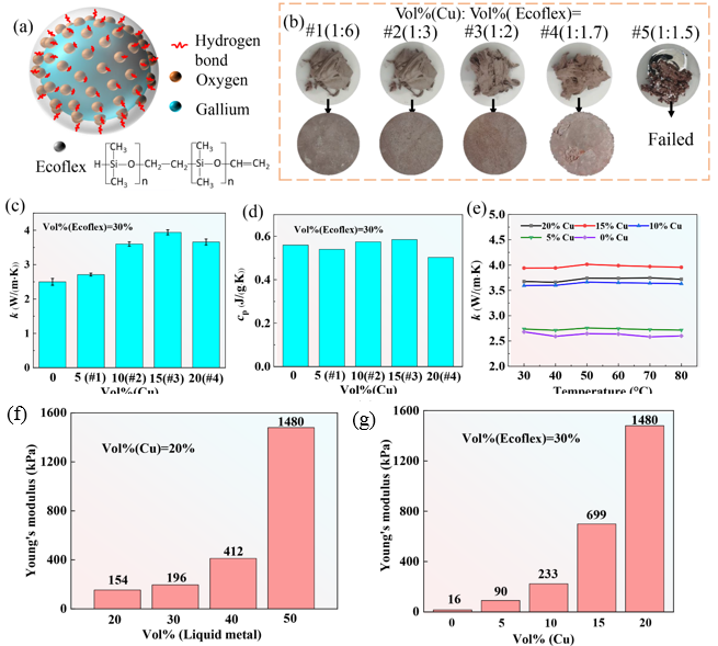 曹炳阳教授课题组提出了一种固体颗粒和液态金属协同掺杂策略用于制备高性能热界面材料。将液态金属与固体颗粒共同作为导热填料,其中液态金属作为主体导热填料,起到构建导热通路的作用,而固体颗粒填料起到进一步强化导热的作用。由于固体颗粒填料的掺杂量较小,复合材料的杨氏模量只略微增加。通过液态金属与固体颗粒导热填料的协同作用,既能提高热界面材料的热导率,又能使其保持较小的杨氏模量。测试表明,体积分数为55%镓基液态金属和15%铜颗粒作为填料时,制备出的热界面材料具有3.94W/(m•K)的热导率和699kPa的杨氏模量。采用其他体积分数填充时,热界面材料的热导率在0.2-4.0W/(m•K)之间变化,杨氏模量在15-1500kPa之间变化。