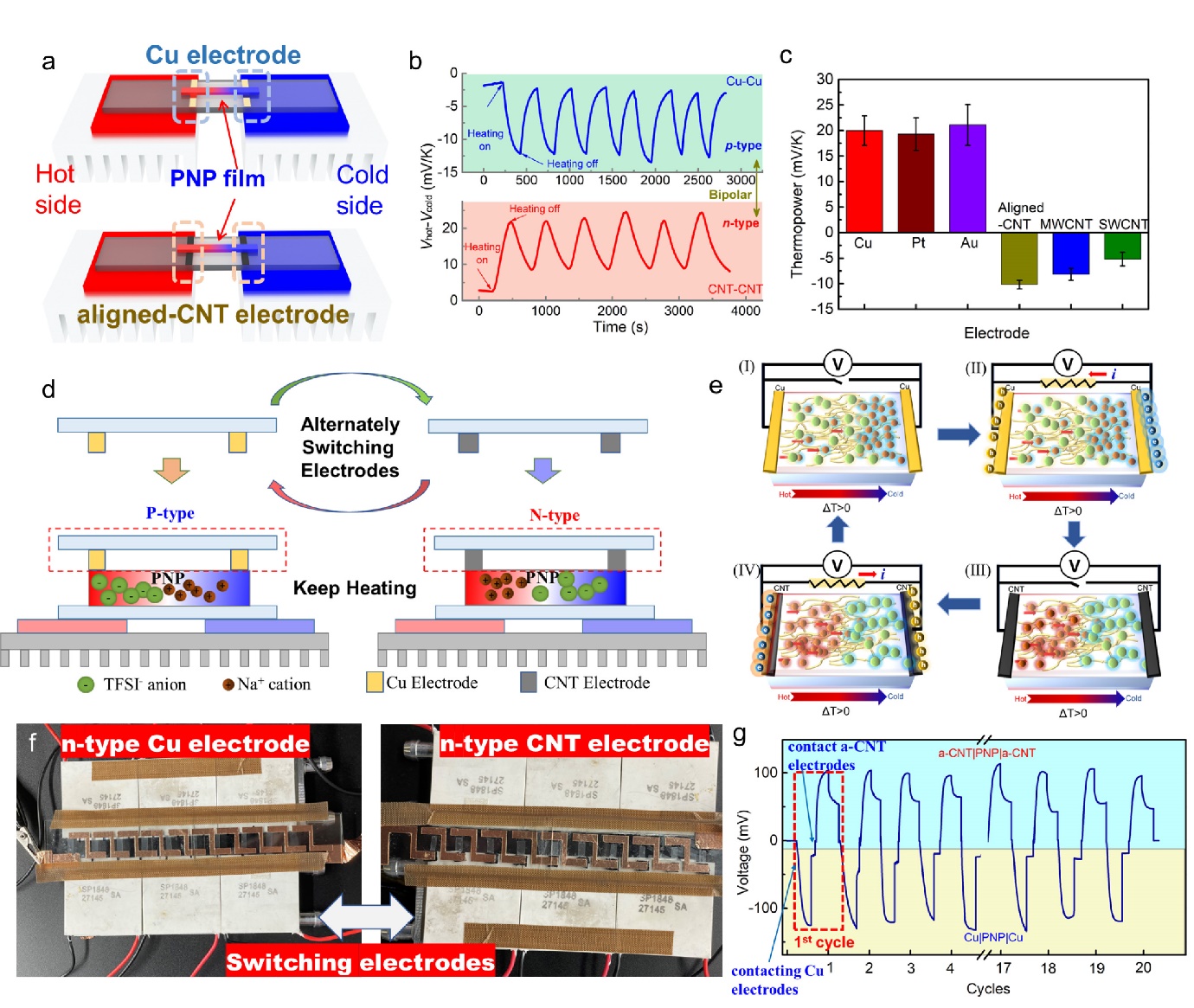 图1:(a)双性P/N型测试结构示意图,(b)采用碳管电极和铜电极测试数据图,(c)P型和N型塞贝克系数数值对比图,(d)可循环离子热电发电器件工作原理示意图,(e)发电过程中离子分布图,(f)可循环离子热电发电器件实物图,和(g)发电器件在恒定温差下工作数据图。
