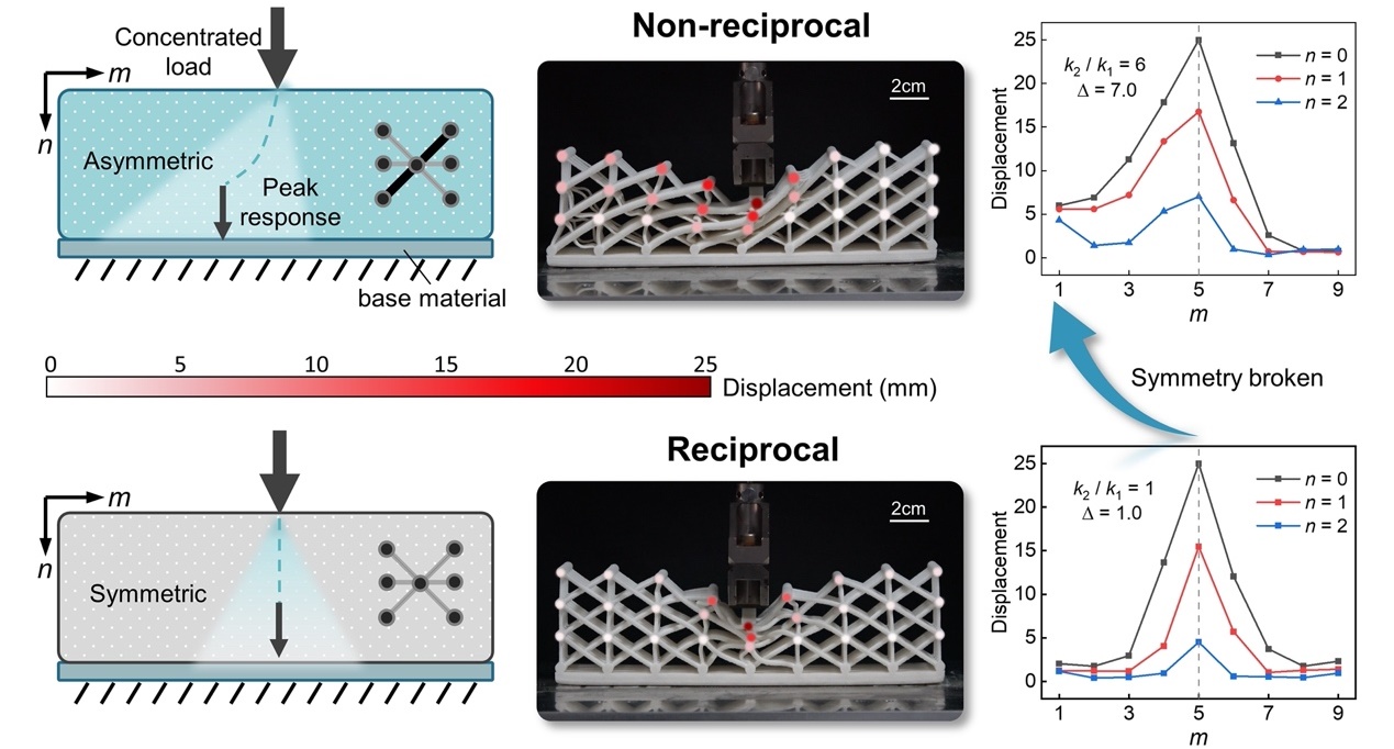 陈常青教授课题组利用力学超材料点阵结构,将低维非保守系统中的弹性波时域动力学演化行为,等效映射为空间尺度上高维点阵结构的静态变形模式,从而在一个静态的保守系统中实现了非厄米拓扑效应(图1)。相较于非厄米动力学系统,该静态系统中仅通过改变点阵的几何构型便能实现非厄米及等效非互易效应,而无需任何主动调控或能量注入,极大地降低了非厄米效应的触发条件(图2)。