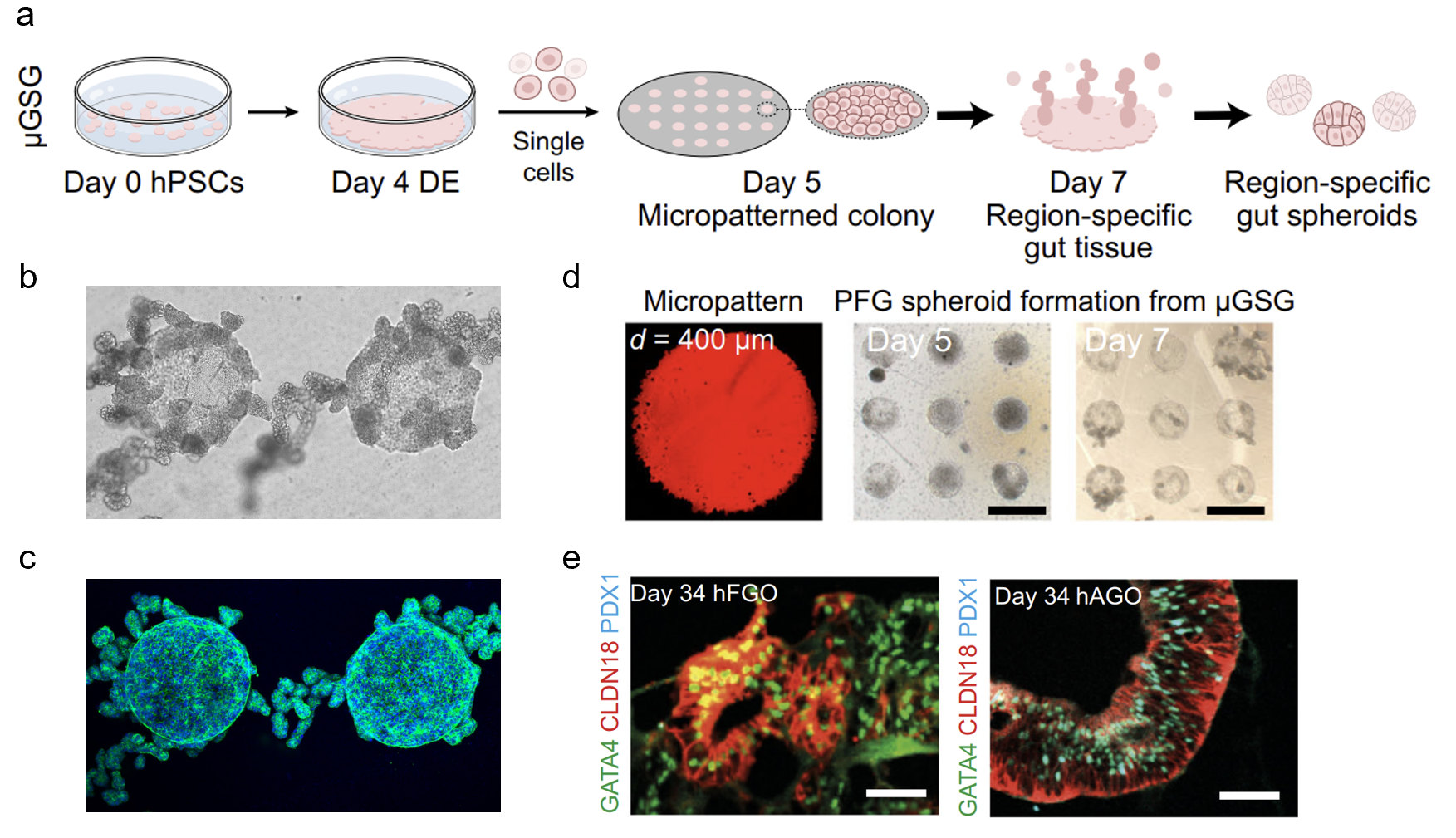 图1.(a)µGSG构建内胚层来源类器官的流程示意图;(b)类器官前体出芽发生的明场图;(c)类器官前体出芽发生的荧光图;(d)微图案荧光图及类器官前体发生过程的明场图;(e)对µGSG产生前体长时程培养(Day34)的免疫荧光染色鉴定