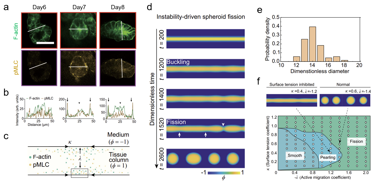 图2.力学失稳驱动的类器官形态发生机制:(a)组织柱断裂前不同天数的细胞骨架免疫荧光染色图;(b)组织柱断裂前不同天数的细胞骨架的荧光分布统计;(c)前体球形态发生的活性相场模型示意图;(d)组织柱断裂产生前体球的模拟结果;(e)通过活性相场模型预测前体球大小;(f)前体球不同形态发生阶段的相场图