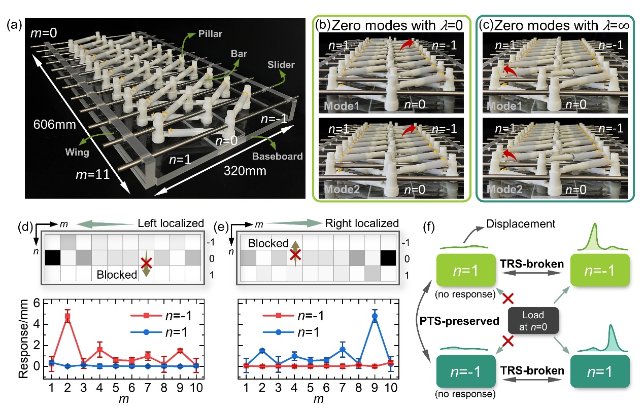 课题组还揭示了静态系统中点群对称性(如镜面对称)与动态系统中某些内部对称性(如时间反演对称)之间的内禀关联。由此可通过改变对称性来定制材料的有序变形图案。在此基础上,课题组利用拓扑能带理论,在静力学系统中构造出了非对称的变形阻塞模式,将偏心载荷完全局域在边界处,实现材料内部的静力学屏蔽(图2)。