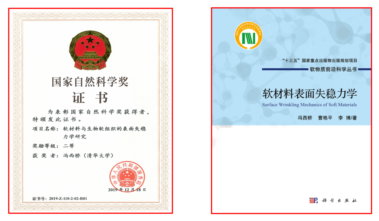 图4 国家自然科学奖证书、《软材料表面失稳力学》专著封面