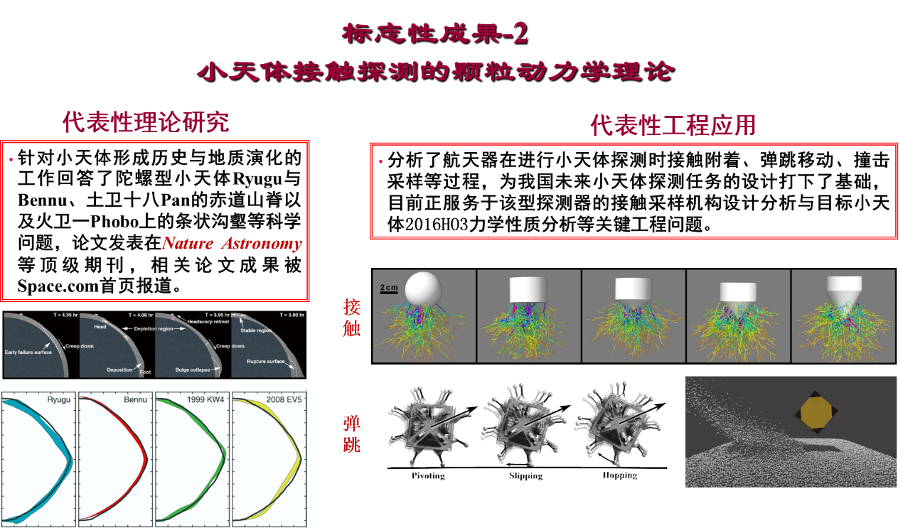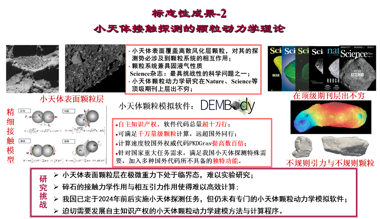 2. 小行星的颗粒系统动力学研究中,建立了高效并行树结构引力N体-离散动力学软球模型,揭示了颗粒物质力学响应的诸多规律,开发了自主知识产权小天体颗粒模拟软件DEMBody,可进行千万量级颗粒的多种动力学行为模式的模拟,计算效率较国外权威代码提高数百倍,对土星环内嵌小卫星吸积形成“太空饺子”和陀螺型小行星自旋加速导致滑坡的演化过程等的仿真与国际观测结果完美吻合,完善了小天体结构演化的动力学理论。