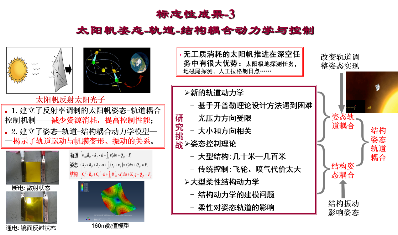 在深空探测、航天器编队飞行、太阳帆飞行器、充液系统动力学、多体系统动力学、载人登月等方面均获得了理论上的突破,发表SCI论文300余篇,得到了国内外同行专家的认可。另一方面,注重将理论研究成果直接应用于航天工程一线,所获得的成果成功应用于我国在研型号的研制中,如“月球二期”扩展任务规划、“天宫一号”与“神舟”飞船交会对接远距离导引段策略设计、“高分辨率对地观测”以及我国大多数新研运载、卫星的贮箱充液系统建模分析、空间机器人系统动力学建模分析等。