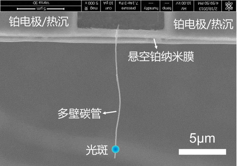 利用微纳加工技术制备了悬空铂纳米膜传感器,利用纳米操作手将单根多壁碳管焊接到铂纳米膜中心位置,准确测得单根碳管的激光吸收系数。